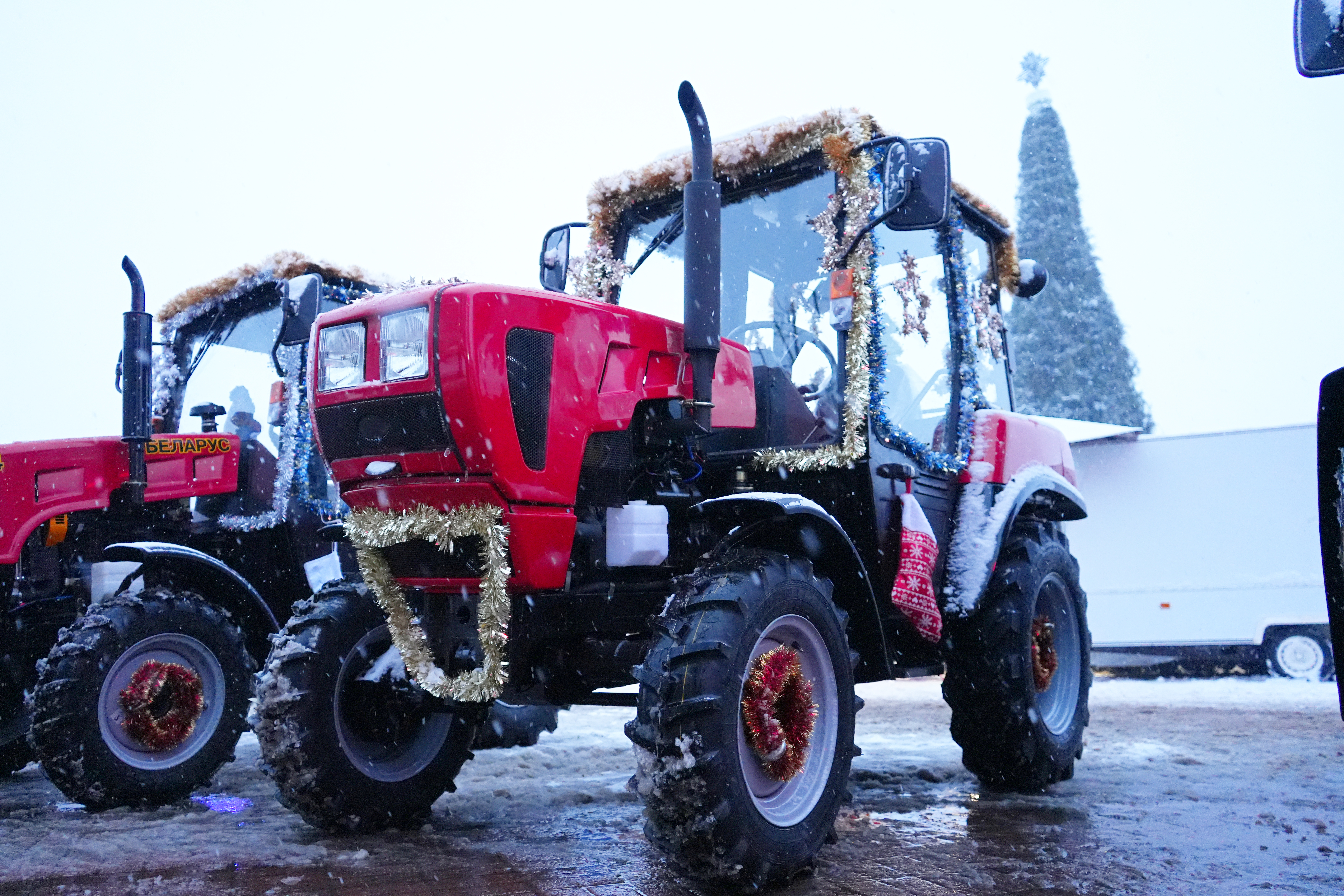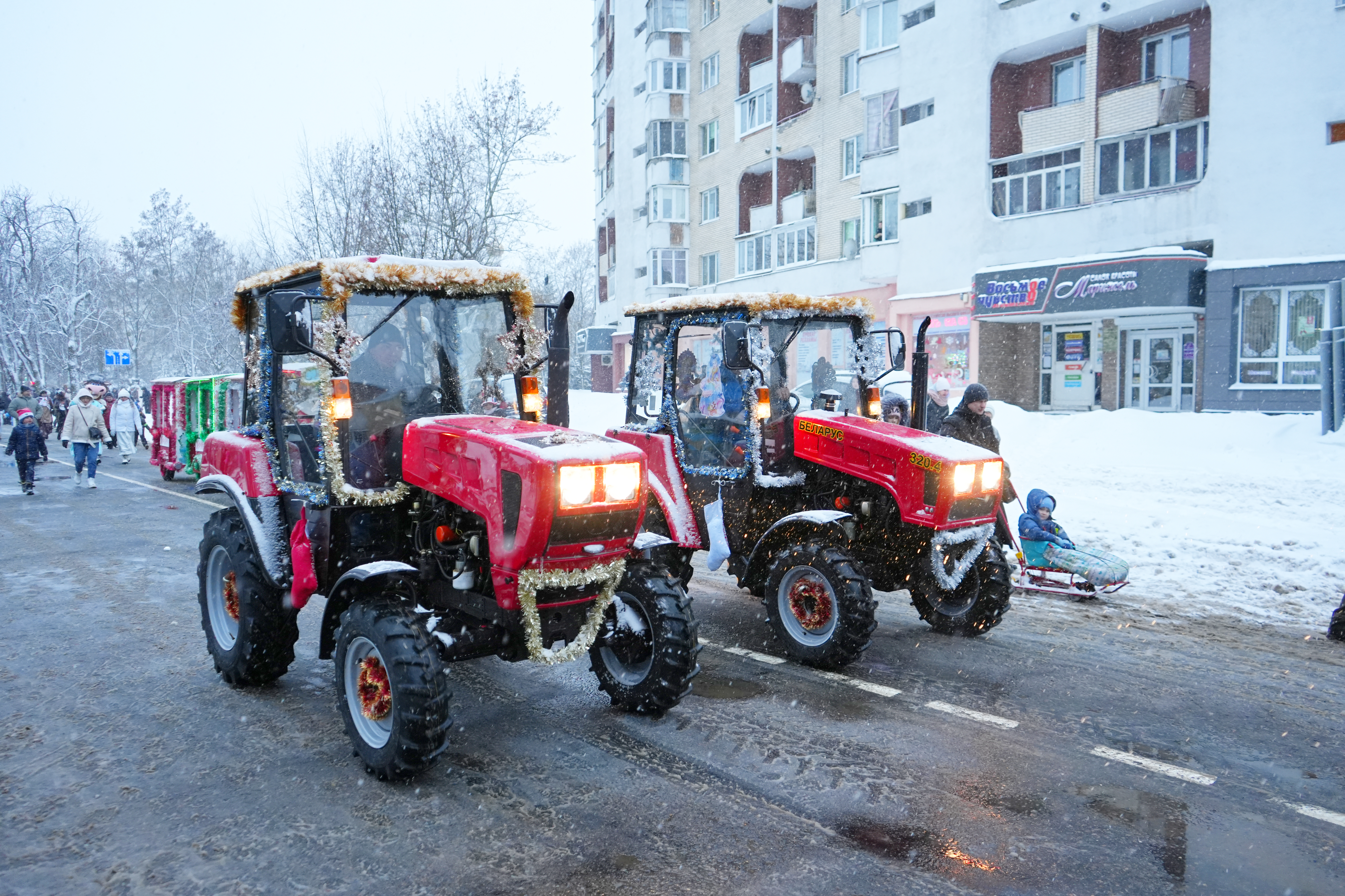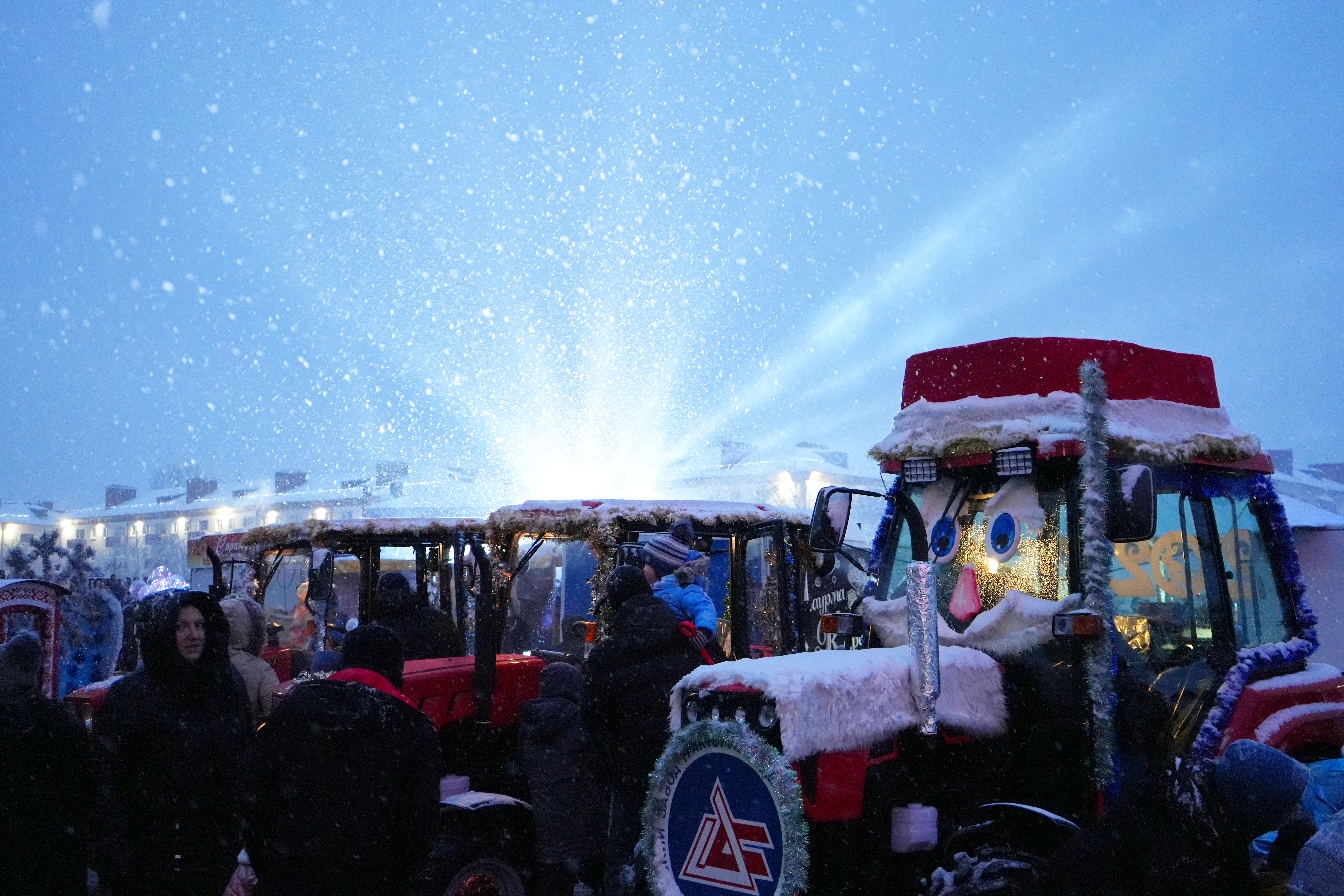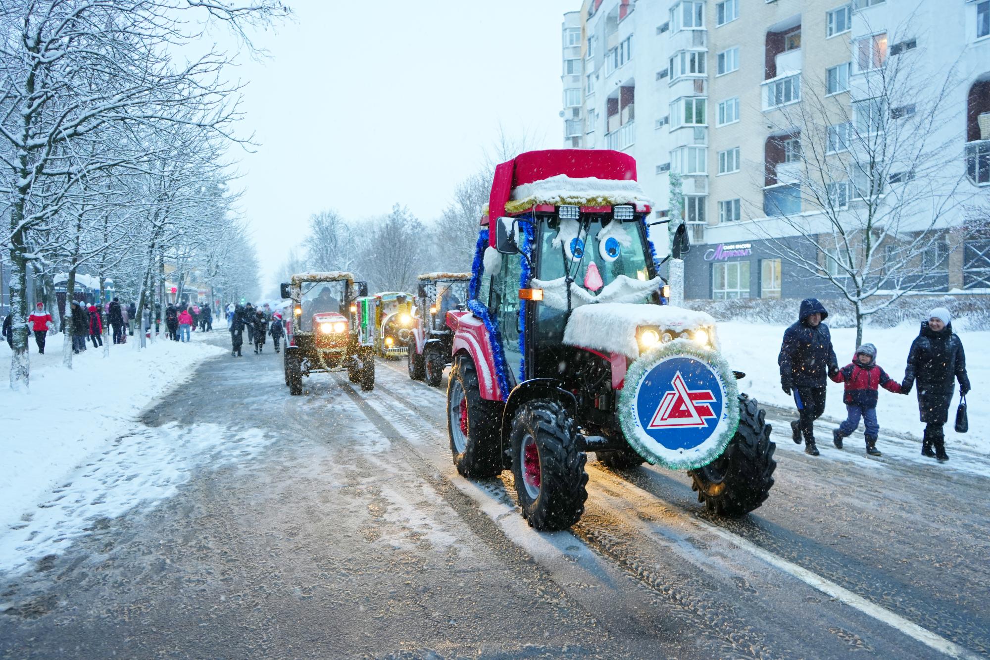 Шествие Дедов Морозов сопровождал кортеж из по-новогоднему украшенных тракторов BELARUS.